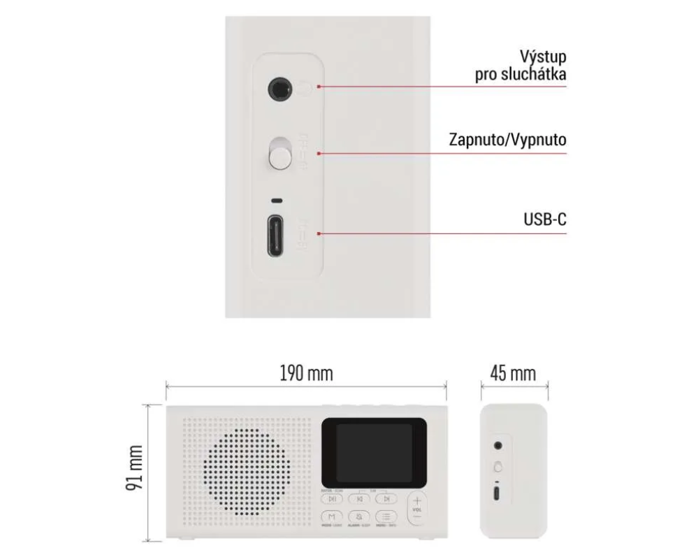 Rádio můžete používat jako duální budík nebo si nastavit čas vypnutí, abyste mohli usínat při oblíbené hudbě. Pomocí Bluetooth jej můžete snadno spárovat s telefonem a přehrávat hudbu z oblíbených platforem, jako je Spotify nebo YouTube. A pokud si chcete hudbu vychutnat nerušeně, stačí připojit sluchátka pomocí 3,5mm jack konektoru.