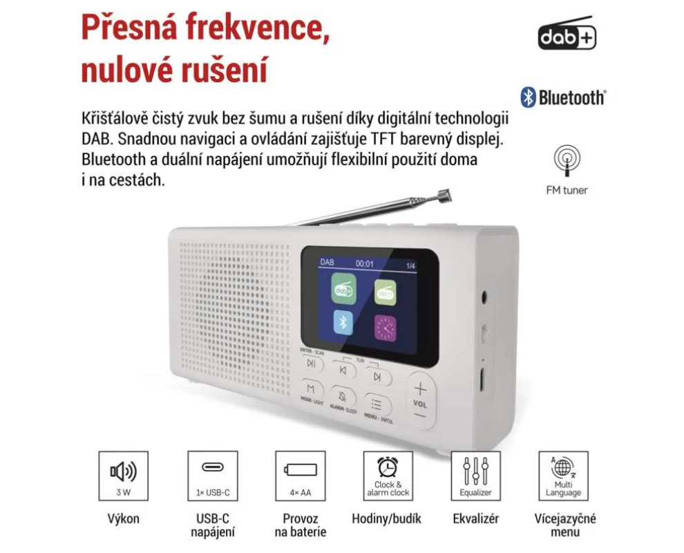 Díky citlivému tuneru naladíte stanice i v odlehlých oblastech a kompaktní design umožňuje vzít rádio kamkoli s sebou.