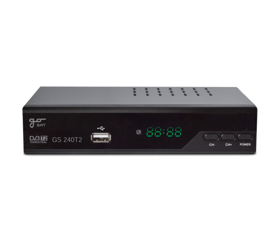 Set-top box GoSAT GS240T2 je inovovaný model přijímače televizního DVB-T2 vysílání. Oproti svým předchůdcům nově nabízí možnost vyhledávat a přehrávat Youtube videa, sledovat IPTV kanály, snadno zálohovat nastavení na USB, nebo využít možnost časovače zapnutí a vypnutí. Samozřejmostí zůstává programovatelný dálkový ovladač pro snadnou obsluhu základních funkcí Vašeho televizoru. Vzhled OSD menu je nyní jednodušší a lépe čitelný zejména v přítmí, rovněž lze upravit jas displeje na předním panelu.