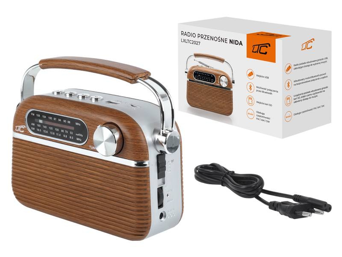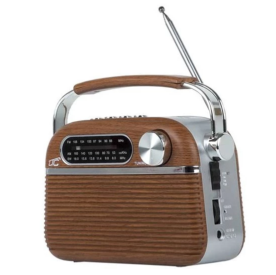 - Přenosné FM rádio v retro stylu s možností napájení stejnosměrným i střídavým proudem, bateriemi R20 a zabudovanou lithium-iontovou baterií o kapacitě 2 000 mAh.